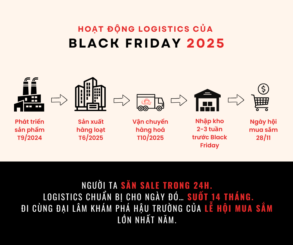 Black Friday 28/11/2025 không chỉ là một ngày mua sắm thông thường. Đằng sau những khoảnh khắc mua sắm cuồng nhiệt là cả một hệ thống logistics khổng lồ được vận hành suốt 14 tháng liền. Từ khâu đàm phán nguyên vật liệu, sản xuất, vận chuyển đường biển, thông quan hải quan, đến phân phối cuối cùng - mỗi bước đều được tính toán kỹ lưỡng để đảm bảo hàng hóa đến tay người tiêu dùng đúng lúc.