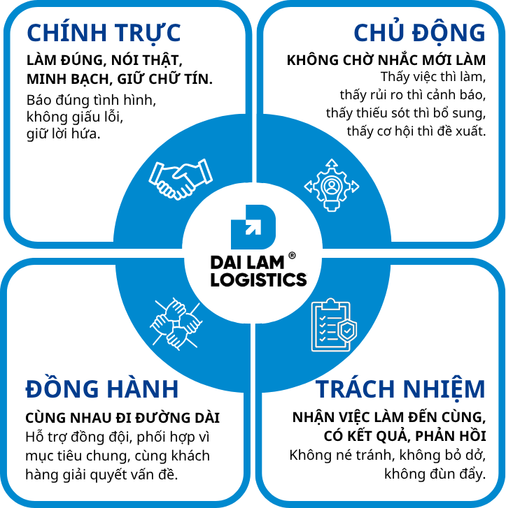 Mỗi nhân sự tại Đại Lâm không chỉ là người thực thi, mà còn là người tư vấn – sẵn sàng đồng hành từ A–Z cùng khách hàng trong mọi tình huống phát sinh, đặc biệt là trong khai báo HS code, kiểm hóa, hoàn thuế hay lưu kho an toàn.
