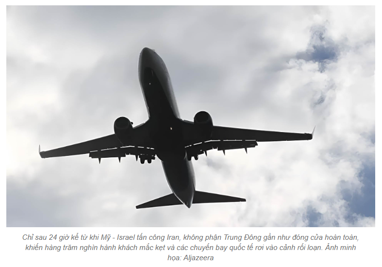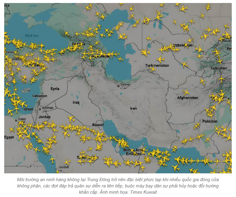 👉 Hệ quả: Bầu trời Trung Đông gần như trống rỗng. Mọi tuyến bay thương mại buộc phải thay đổi lộ trình, bay vòng qua Saudi Arabia hoặc Biển Đỏ, làm đảo lộn hoàn toàn lịch trình vận tải toàn cầu.